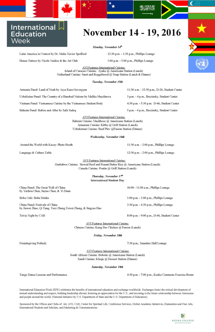 IEW Spotlights: Latin America; Country Panels from: Armenia, Bahrain, China, Uzbekistan, and Vietnam; Photo Booth with Kacey, Tango Dance Lessons and Performance, and Friends giving Potluck. See the schedule here for more details.